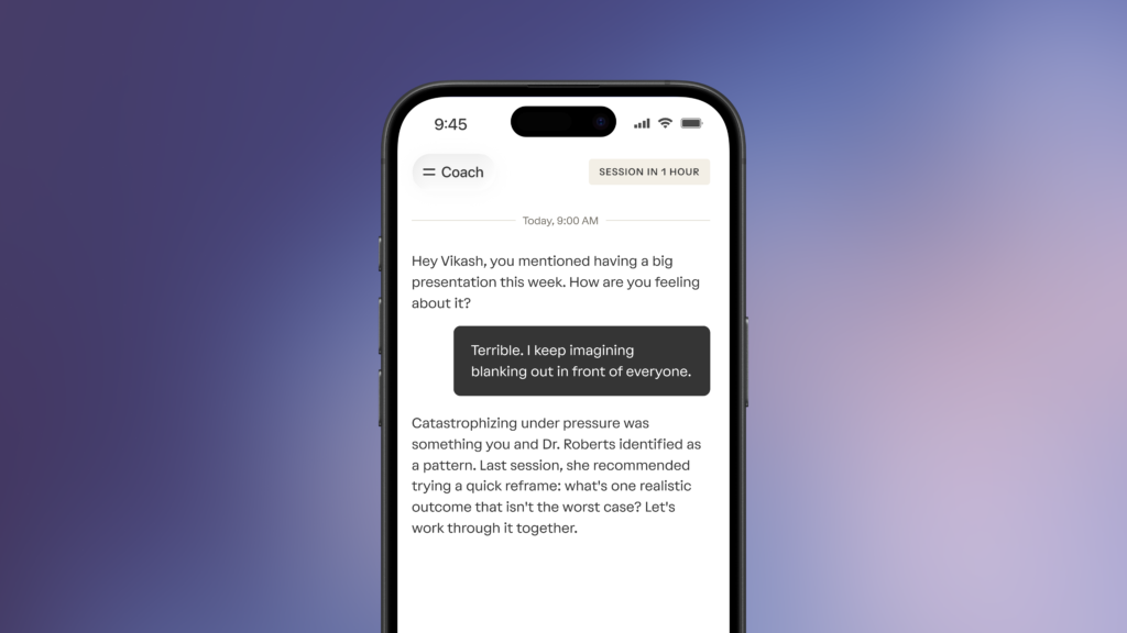 - Thought organization and session prep, solving the “cold start” problem of not knowing what to bring up with their therapist.