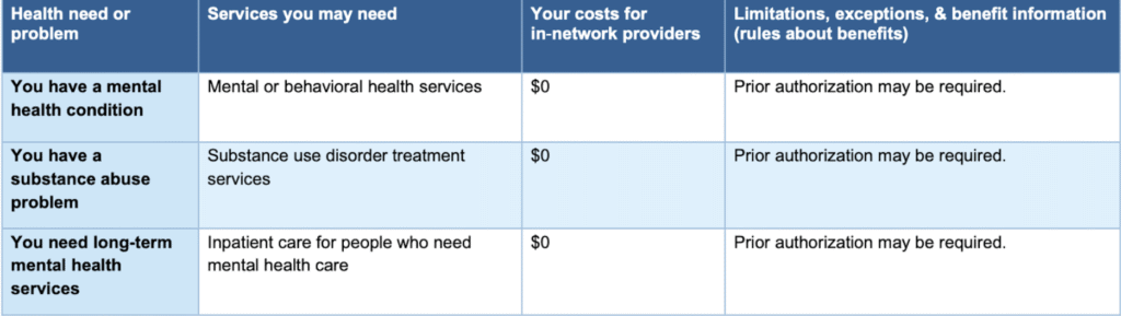 On the summary of benefits, look for a row that references mental health, behavioral health, or substance abuse services. It is also helpful to check “outpatient services” because therapy is considered to be outpatient care.