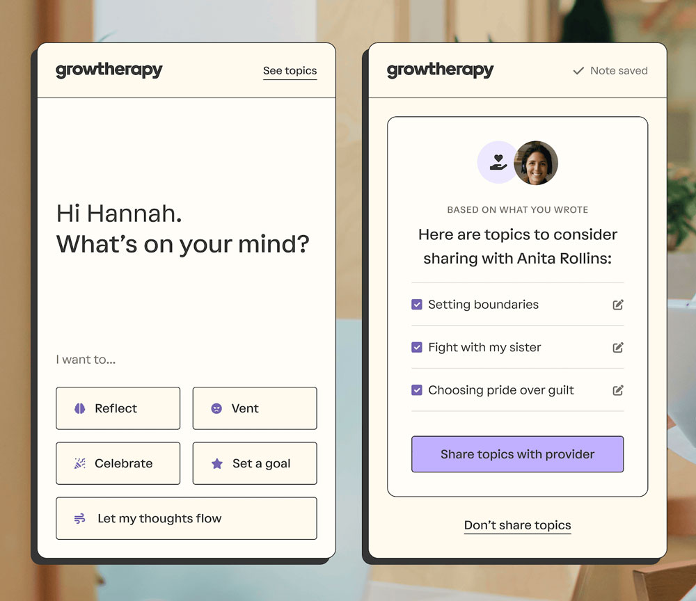 “Since most of life is happening outside of a session, a key aspect of therapy is knowing what to focus on in order to make each session as impactful as possible,” said Kevin Ramotar, Psy.D., Director of Clinical Product at Grow Therapy.