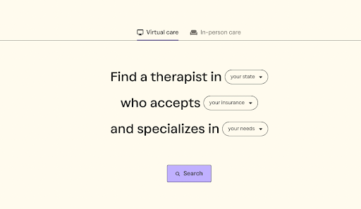 This platform allows clients to find a therapist who’s right for them with an easy-to-navigate marketplace. You will start off by selecting whether you want virtual or in-person care, as well as your state, insurance, and needs. Then, you will see a list of high-quality providers that meet your criteria.