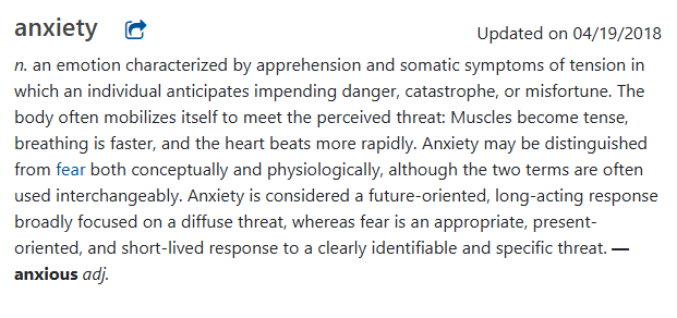 - Anxiety is the anticipation of a future threat. It’s that uneasy feeling that something might go wrong, even if you can’t quite say what. It’s internal and uncertain, often causing ongoing worry, physical tension, or avoidance.