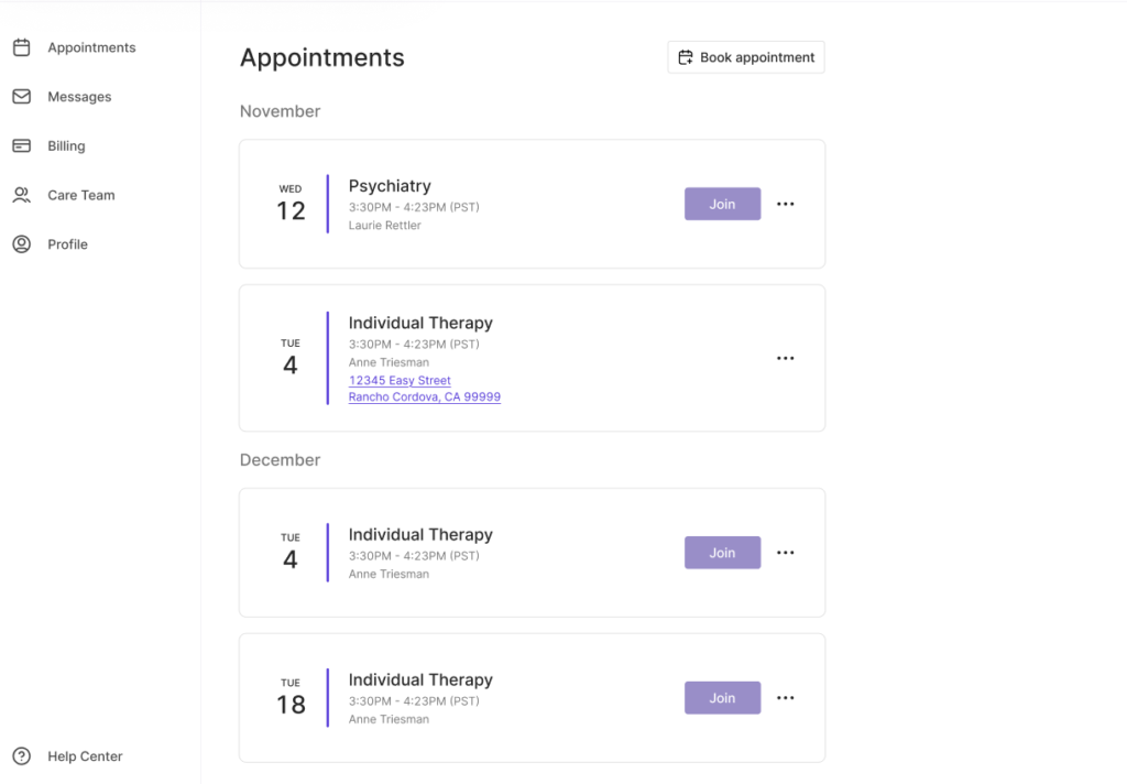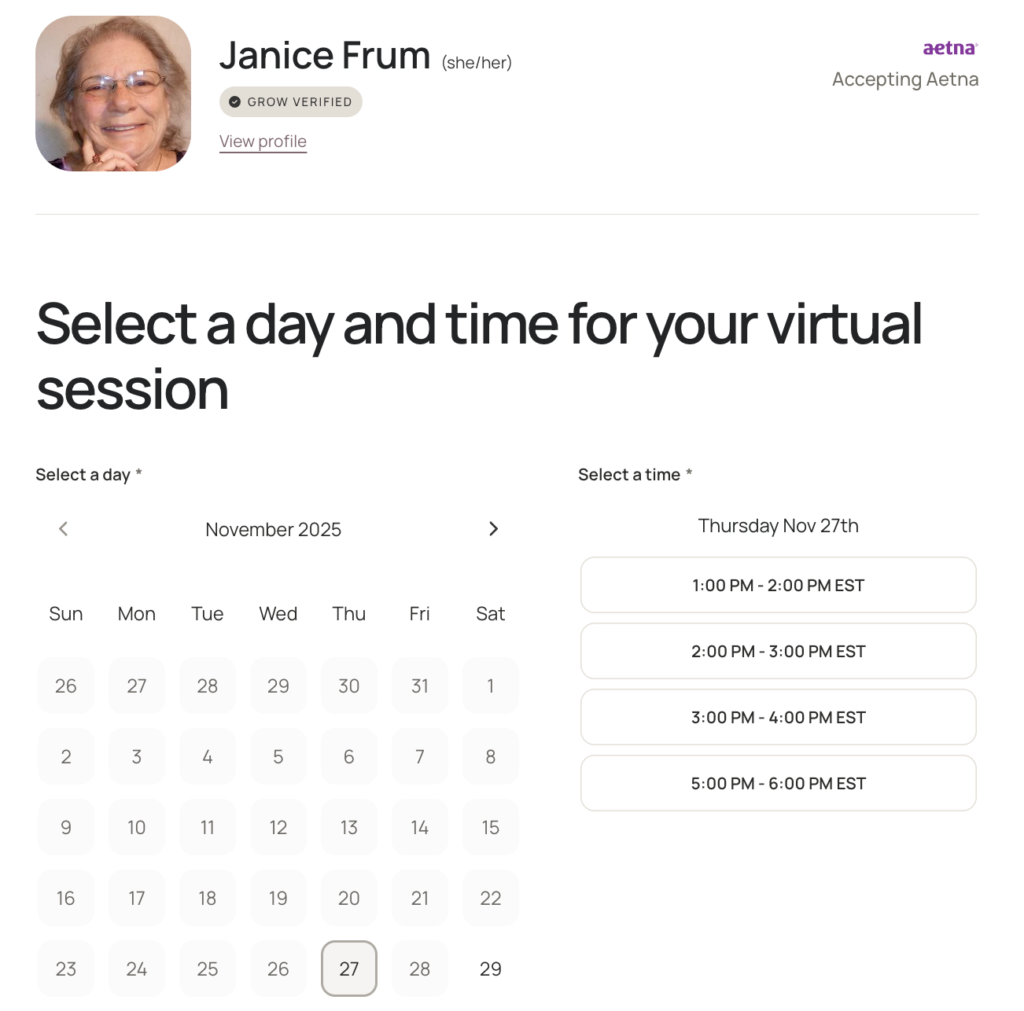 Grow Therapy also offers flexible scheduling that makes it easier for clients to start care quickly. Many clients are able to schedule an appointment as soon as the next day, which can be significantly faster than typical wait times for behavioral health services in many areas. Many providers offer a mix of daytime, evening, and weekend appointments, giving clients more options to fit therapy into their routines. And with both virtual and in-person sessions available, clients can choose the format that works best for them. While availability can vary by location and provider, the overall flexibility helps clients build a therapy schedule that feels realistic and sustainable.